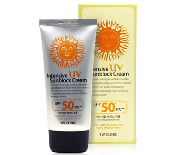 3W CLINIC Intensive UV Sunblock Cream SPF50+ PA+++. Lightweight, moisturizing sunscreen that protects, soothes, and evens skin tone. Absorbs quickly with no white cast, perfect for daily use and under makeup.